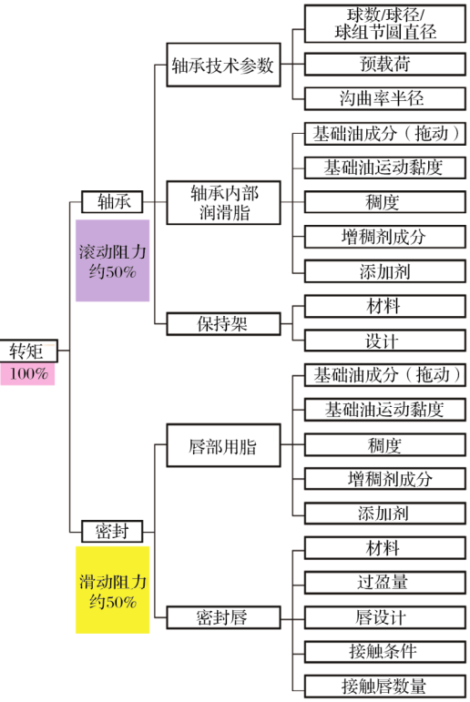 輪轂軸承的轉(zhuǎn)矩由軸承的滾動阻力和密封(外部密封和內(nèi)部密封)的滑動阻力組成,各占約50%。影響輪轂軸承轉(zhuǎn)矩的各種因素如圖2所示,各種減摩技術(shù)包括:優(yōu)化軸承結(jié)構(gòu)參數(shù)、改進(jìn)軸承內(nèi)部潤滑脂來減少滾動阻力;改進(jìn)密封橡膠材料、優(yōu)化密封結(jié)構(gòu)和密封過盈量來減少滑動阻力。