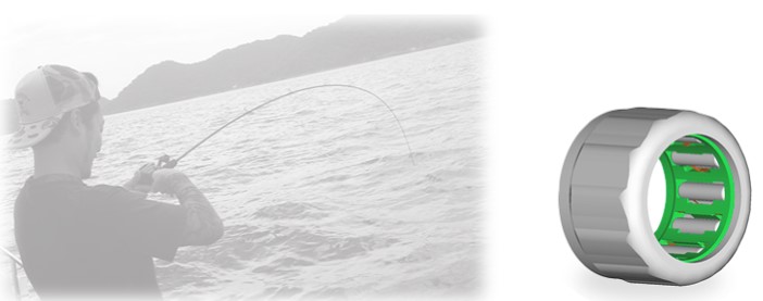 應(yīng)用在釣具漁輪中魚線回收止逆機構(gòu)的小型單向軸承,采用樹脂材料保持架,軸承外圈使用沖壓加工方式減少外圈厚度,實現(xiàn)減輕軸承重量,進而實現(xiàn)漁輪的輕量化。