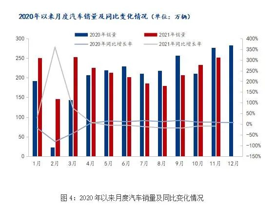據(jù)中國(guó)汽車工業(yè)協(xié)會(huì)統(tǒng)計(jì)分析,2021年12月,汽車產(chǎn)銷分別完成290.7萬輛和278.6萬輛,環(huán)比分別增長(zhǎng)12.5%和10.5%,產(chǎn)量同比增長(zhǎng)2.4%,銷量同比下降1.6%。2021年,我國(guó)汽車產(chǎn)銷分別完成2608.2萬輛和2627.5萬輛,同比分別增長(zhǎng)3.4%和3.8%,結(jié)束了連續(xù)3年的下降趨勢(shì)。新能源汽車銷售完成352.1萬輛,同比增長(zhǎng)1.6倍。