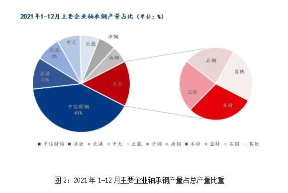 從圖2可以看出,目前軸承鋼產(chǎn)量較大的生產(chǎn)企業(yè)分別是:中信特鋼(興澄特鋼、大冶特鋼、青島鋼鐵)、中天和本鋼,占到總產(chǎn)量的60%。2021年軸承鋼整體產(chǎn)量在增加,濟(jì)源、邢鋼、石鋼、北滿、沙鋼、西寧、南鋼、中特等鋼廠產(chǎn)量較去年同期相比均有增加,僅建龍、本鋼、巨能、中天等鋼廠產(chǎn)量有所減少。