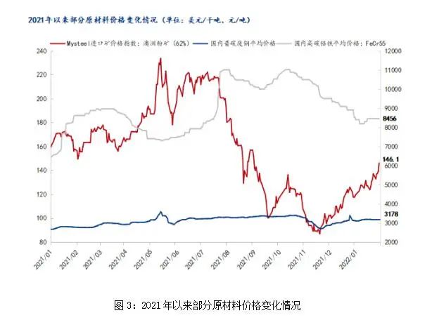 1月份鐵礦石價(jià)格大幅上漲,62%澳粉指數(shù)為146.1美元/干噸。展望2月份,鐵礦石近端基本面供需雙弱,但供大于求的格局未變。目前鐵礦石港口庫(kù)存主流品種資源相對(duì)充裕,一旦節(jié)后終端需求啟動(dòng)較緩或鋼廠減產(chǎn)略超預(yù)期,那么鐵礦石回調(diào)的可能性及幅度將會(huì)明顯加大;國(guó)內(nèi)廢鋼震蕩上行,月末均價(jià)在3178元/噸。受到鋼材價(jià)格及原材料價(jià)格較為堅(jiān)挺的影響,廢鋼價(jià)格有支撐,同時(shí)春節(jié)前夕,鋼廠廢鋼冬儲(chǔ)積極備庫(kù),整體需求較好,廢鋼價(jià)格表現(xiàn)甚至強(qiáng)于鋼材。節(jié)后廢鋼價(jià)格或因補(bǔ)庫(kù)等原因有一定支撐,價(jià)格偏強(qiáng)運(yùn)行,但由于廢鋼價(jià)格偏高,鋼廠生產(chǎn)壓力較大,后期回落的風(fēng)險(xiǎn)較大,區(qū)域之間或有一定分化,需關(guān)注電弧爐鋼廠復(fù)工情況;高碳鉻鐵市場(chǎng)盤整運(yùn)行,月末價(jià)格在8456元/噸。受礦端及其他原材料上浮,鉻鐵冶煉成本抬升,全國(guó)鉻鐵減產(chǎn)力度增強(qiáng)。1月高碳鉻鐵產(chǎn)量為59.38萬噸,環(huán)比減少9.9%。部分鋼廠節(jié)前已積極備貨,節(jié)后需求將繼續(xù)回暖,基本面修復(fù)或?qū)⒗^續(xù)提振節(jié)后鉻系市場(chǎng)。
