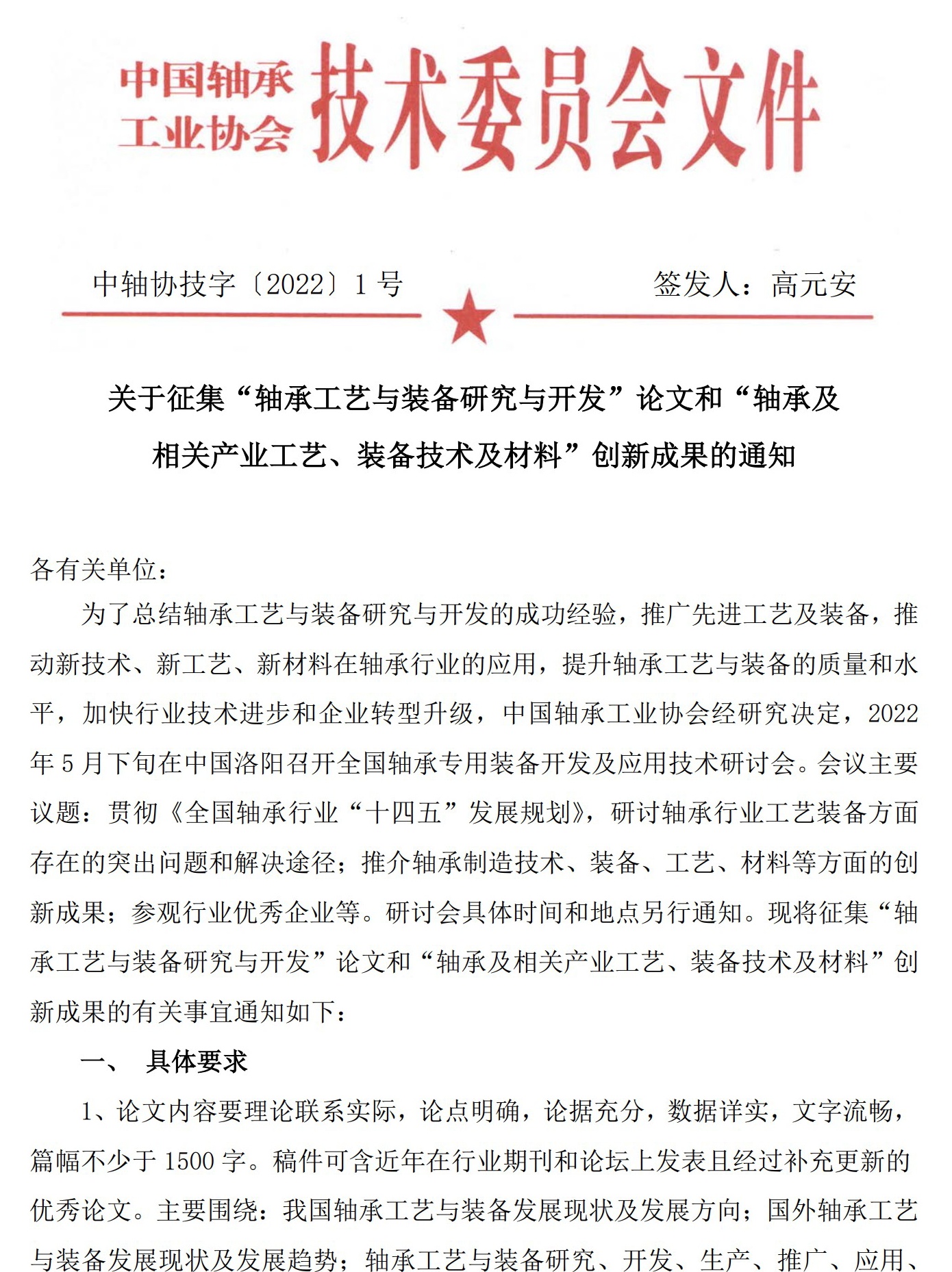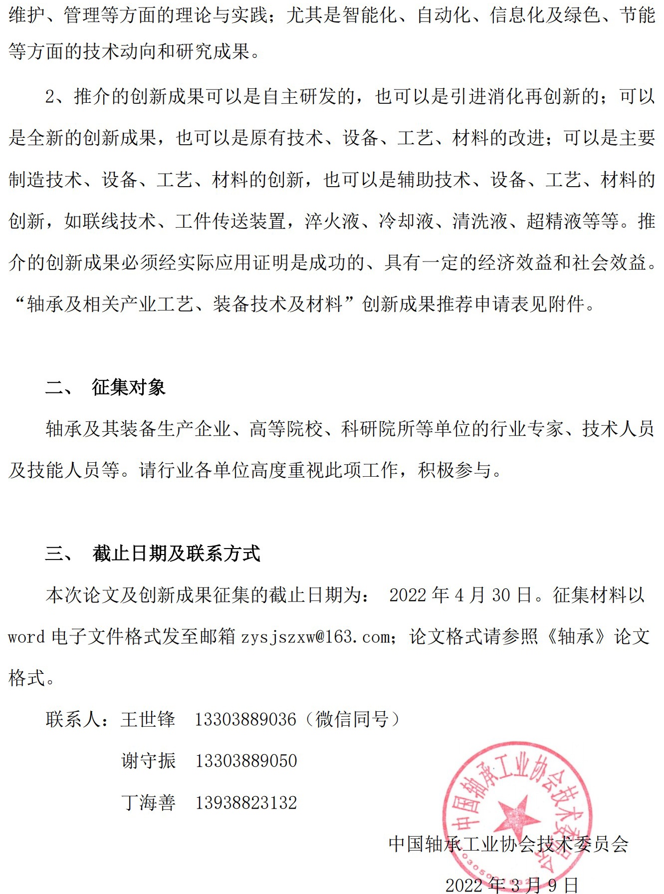 為了總結軸承工藝與裝備研究與開發(fā)的成功經驗,推廣先進工藝及裝備,推動新技術、新工藝、新材料在軸承行業(yè)的應用,提升軸承工藝與裝備的質量和水平,加快行業(yè)技術進步和企業(yè)轉型升級,中國軸承工業(yè)協(xié)會經研究決定,2022年5月下旬在中國洛陽召開全國軸承專用裝備開發(fā)及應用技術研討會。會議主要議題:貫徹《全國軸承行業(yè)“十四五”發(fā)展規(guī)劃》,研討軸承行業(yè)工藝裝備方面存在的突出問題和解決途徑;推介軸承制造技術、裝備、工藝、材料等方面的創(chuàng)新成果;參觀行業(yè)優(yōu)秀企業(yè)等。研討會具體時間和地點另行通知?,F(xiàn)將征集“軸承工藝與裝備研究與開發(fā)”論文和“軸承及相關產業(yè)工藝、裝備技術及材料”創(chuàng)新成果的有關事宜通知如下: