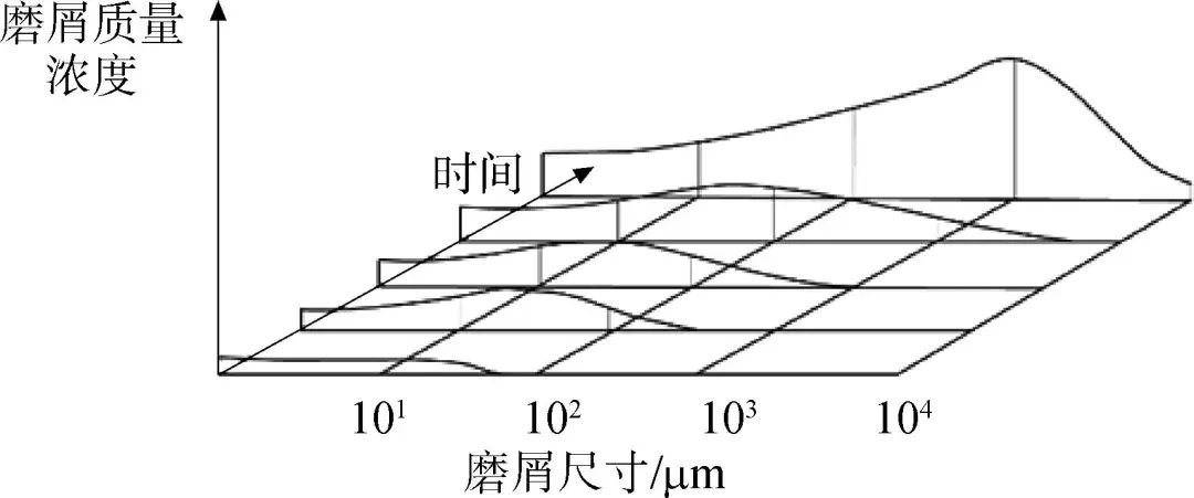 主軸軸承通常都有大流量潤滑油循環(huán)使用,當(dāng)出現(xiàn)磨損、疲勞等會產(chǎn)生顆粒進(jìn)入潤滑油。潤滑系統(tǒng)中的磨屑質(zhì)量濃度和顆粒尺寸會隨時間變化,如圖4所示,根據(jù)潤滑系統(tǒng)中的磨屑尺寸、質(zhì)量濃度、形貌、成分可以判斷設(shè)備是否故障及故障位置。
