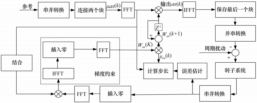 文獻(xiàn)[26]提出了一種基于頻域自適應(yīng)的LMS算法,單一通道不平衡振動(dòng)自適應(yīng)控制框圖如圖14所示,其以諧波振動(dòng)作為輸入,參考輸入為引入的與傳感器跳動(dòng)具有相同分量的正弦信號(hào),仿真結(jié)果表明該方法能有效提取磁懸浮轉(zhuǎn)子不平衡同頻振動(dòng)信號(hào)。