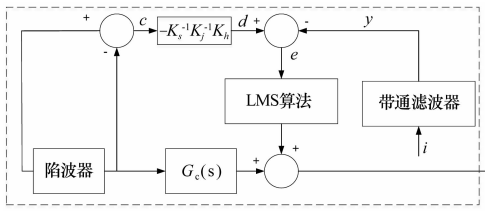 20世紀(jì)80年代,自適應(yīng)濾波算法獲得蓬勃發(fā)展,起初在噪聲消除方面應(yīng)用廣泛。LMS算法由于原理簡(jiǎn)單,自適應(yīng)、抗干擾能力強(qiáng),收斂性好等優(yōu)點(diǎn)獲得了廣泛應(yīng)用,并于20世紀(jì)90年代應(yīng)用于磁懸浮轉(zhuǎn)子不平衡振動(dòng)控制領(lǐng)域。LMS算法實(shí)際上是一種離散自適應(yīng)陷波器,其原理如圖5所示。文獻(xiàn)[14]在2009年提出了基于LMS算法的實(shí)時(shí)變頻切換控制策略,降低了周期性不平衡激振力;隨后,為兼顧穩(wěn)定性和收斂速度,提出了變步長(zhǎng)LMS算法并在不同定轉(zhuǎn)速試驗(yàn)中取得了較好效果,而將H∞算法與自適應(yīng)步長(zhǎng)LMS算法相結(jié)合實(shí)現(xiàn)實(shí)時(shí)最小慣性力補(bǔ)償,則提高了整個(gè)系統(tǒng)的魯棒穩(wěn)定性和抗干擾性能。另外,文獻(xiàn)[17]提出了一種基于LMS算法的自適應(yīng)前饋補(bǔ)償,抵消了功放低通特性的影響,其方法原理如圖6所示。