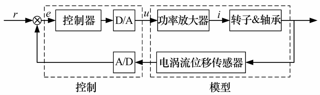 磁懸浮柔性轉(zhuǎn)子系統(tǒng)是典型的機(jī)電一體化系統(tǒng),包括控制器、D/A轉(zhuǎn)換模塊、功率放大器、轉(zhuǎn)子、定子、電渦流位移傳感器和A/D轉(zhuǎn)換模塊,典型的磁懸浮轉(zhuǎn)子系統(tǒng)結(jié)構(gòu)如圖1所示。磁懸浮轉(zhuǎn)子的閉環(huán)控制系統(tǒng)原理如圖2所示:電渦流位移傳感器檢測(cè)轉(zhuǎn)子相對(duì)于參考位置r的偏移e,經(jīng)A/D轉(zhuǎn)換后作為數(shù)字量輸入到控制器,控制器經(jīng)過(guò)相應(yīng)的控制算法運(yùn)算輸出控制信號(hào)u,經(jīng) D/A轉(zhuǎn)換后輸入到功率放大器,功率放大器產(chǎn)生控制電流i并使轉(zhuǎn)子穩(wěn)定在平衡位置。