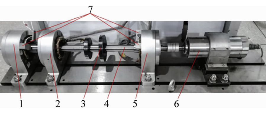 1—非驅(qū)動(dòng)端徑向磁軸承;2—激勵(lì)磁軸承;3—盤片;4—轉(zhuǎn)軸;5—驅(qū)動(dòng)端徑向磁軸承;6—電動(dòng)機(jī);7—位移傳感器。