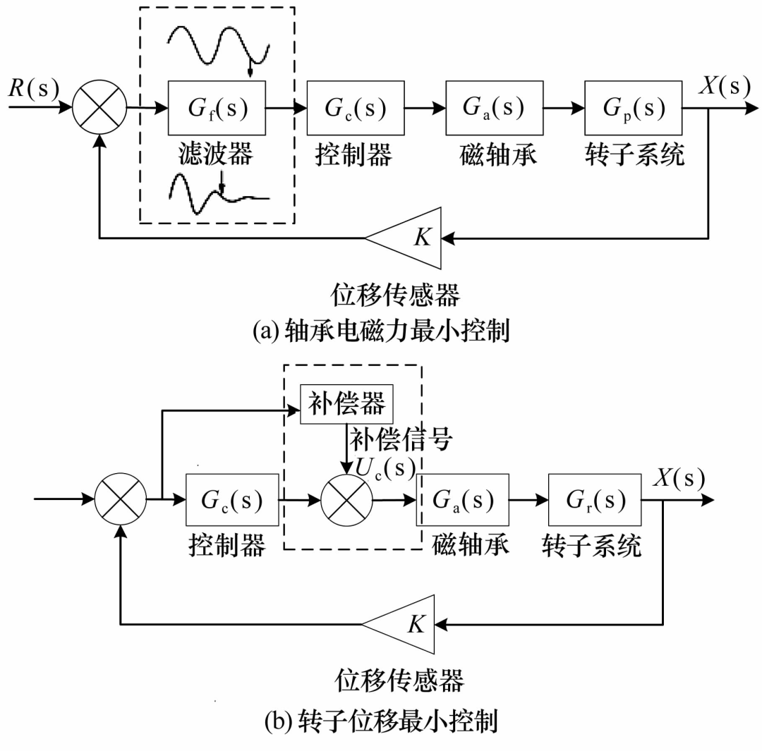 目前,磁懸浮轉(zhuǎn)子不平衡振動(dòng)控制策略有軸承電磁力最小控制和轉(zhuǎn)子位移最小控制這2種。