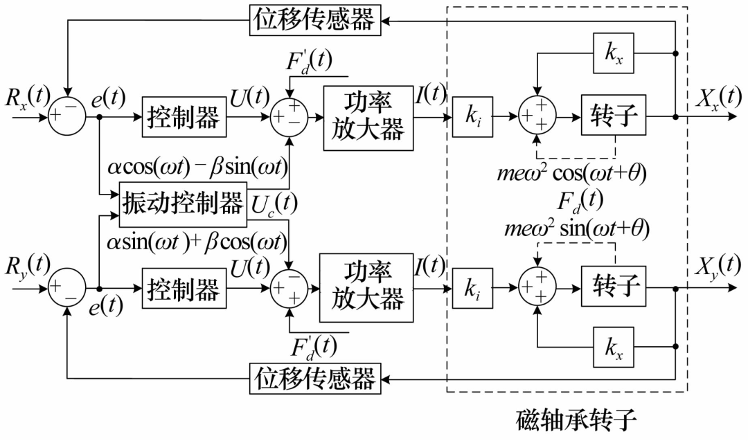 傳統(tǒng)結(jié)構(gòu)軸承作為支承時(shí)不具備主動(dòng)控制特性,由其支承的轉(zhuǎn)子只能在實(shí)際運(yùn)行前進(jìn)行離線動(dòng)平衡,而且轉(zhuǎn)子經(jīng)過(guò)動(dòng)平衡后仍存在殘余不平衡量,當(dāng)轉(zhuǎn)子因負(fù)載變化或生銹等原因?qū)е虏黄胶馇闆r發(fā)生改變時(shí),動(dòng)平衡將失效。磁軸承的剛度相對(duì)于傳統(tǒng)結(jié)構(gòu)軸承較小且懸浮氣隙較大,當(dāng)轉(zhuǎn)子不平衡力較大時(shí),轉(zhuǎn)子振動(dòng)會(huì)更加劇烈;但磁軸承控制參數(shù)與控制電流可調(diào),使其具備實(shí)時(shí)主動(dòng)控制能力,為轉(zhuǎn)子的不平衡振動(dòng)控制提供可能。