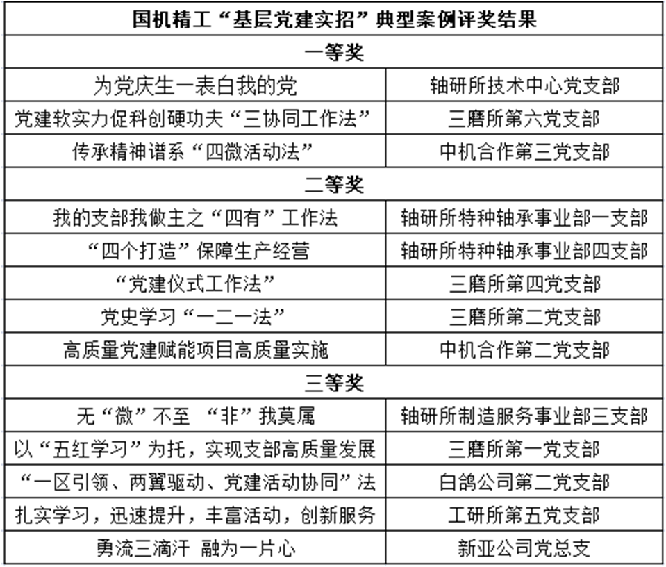 經(jīng)國機精工黨委遴選評比,公司技術(shù)中心黨支部《為黨慶生——表白我的黨》榮獲評比一等獎;特種軸承事業(yè)部一支部《我的支部我做主之“四有”工作法》、特種軸承事業(yè)部四支部《“四個打造”保障生產(chǎn)經(jīng)營》榮獲評比二等獎;制造服務事業(yè)部三支部《無“微”不至“非”我莫屬》榮獲評比三等獎;公司黨委榮獲優(yōu)秀組織獎。