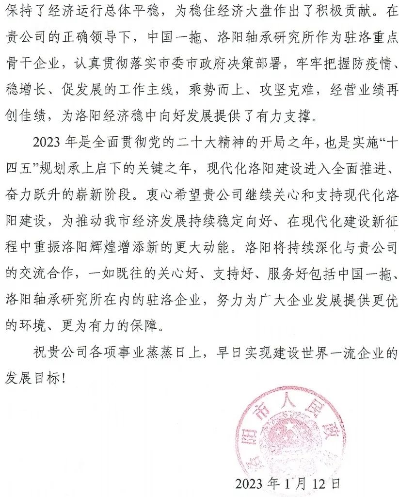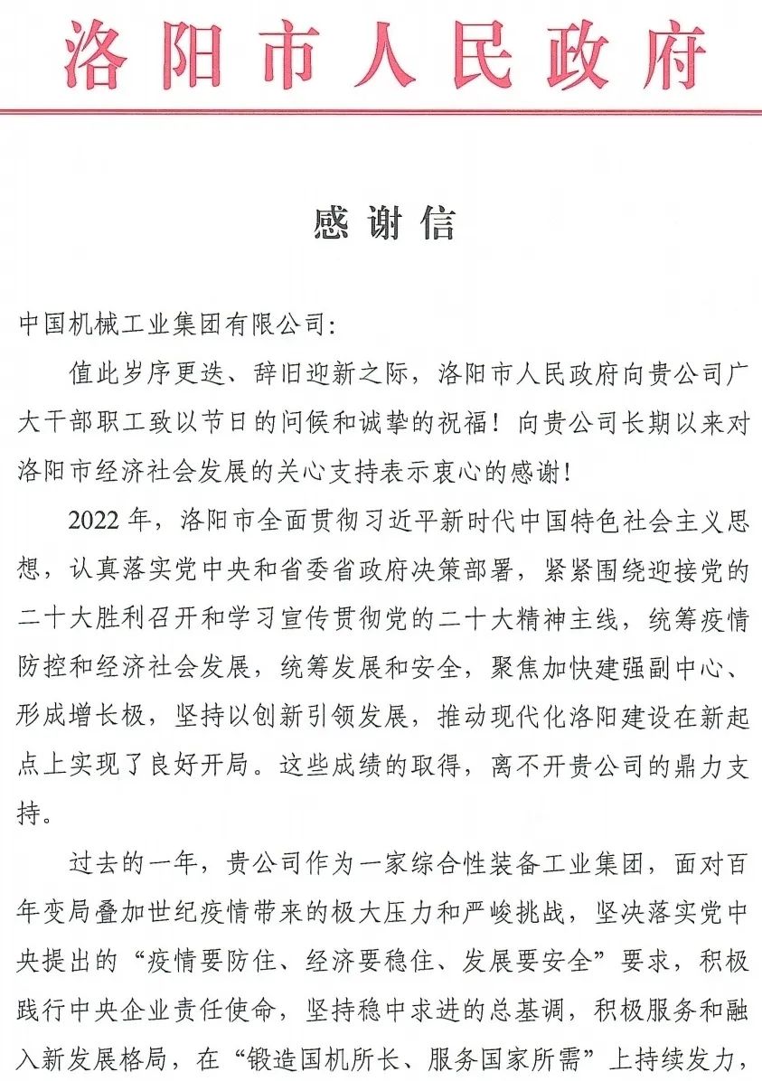 1月12日,國機(jī)集團(tuán)收到洛陽市人民政府發(fā)來的感謝信,信中充分肯定了軸研所面對(duì)世紀(jì)疫情帶來的巨大沖擊,迎難而上,勠力同心,再創(chuàng)佳績,為洛陽經(jīng)濟(jì)穩(wěn)中向好發(fā)展提供了有力支撐。