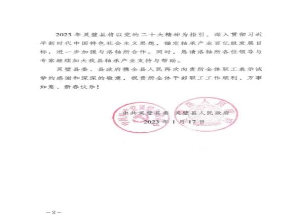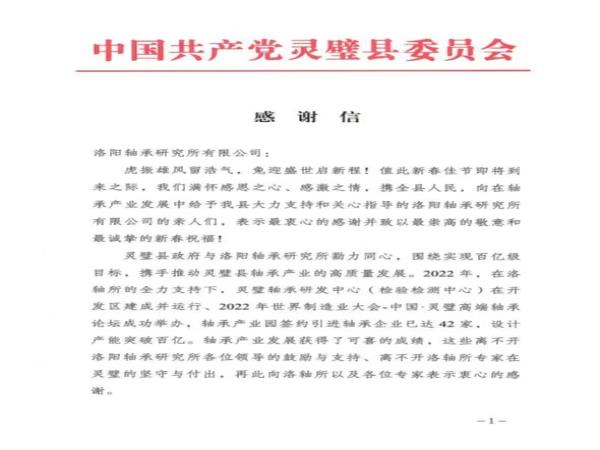 近日,公司收到靈璧縣委、縣政府的感謝信,信中充分肯定了公司對建設(shè)靈璧軸承研發(fā)中心所作出的重要貢獻(xiàn),對公司表達(dá)了敬意和感謝,并希望與公司持續(xù)開展深層次合作。