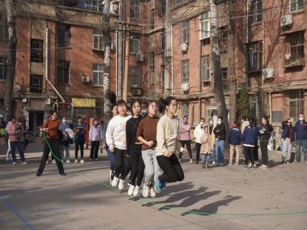 “一、二、三、四……”在氣勢如虹的計數聲中,隊員們通力合作、默契配合,搖繩的隊員手腕翻飛,跳繩的隊員疾如飛燕。絆倒了也不言放棄,迅速調整步伐,重新投入比賽,繩子擦過地面發(fā)出清脆的“噠噠”聲,伴隨著不絕于耳的加油聲、歡呼聲,把現場氣氛一次次推向高潮。