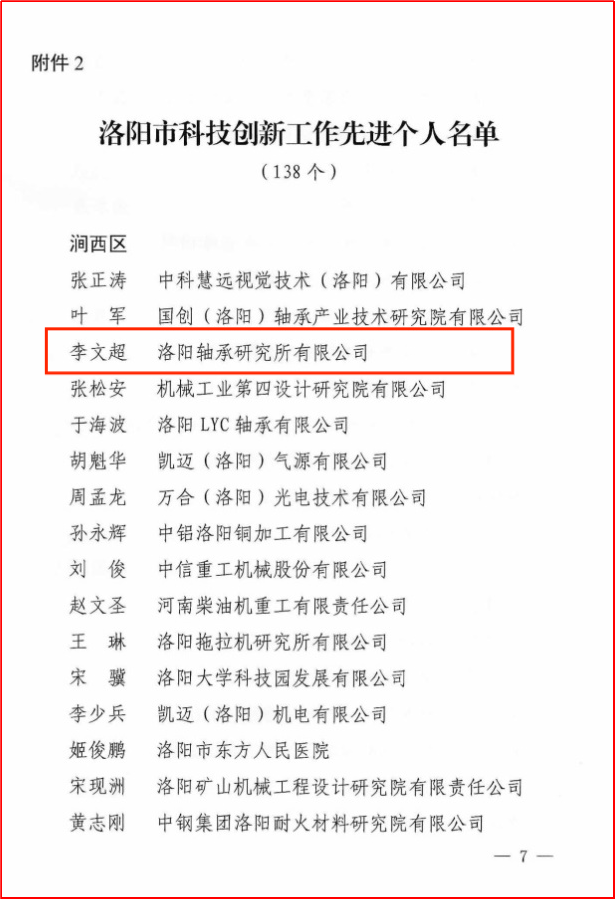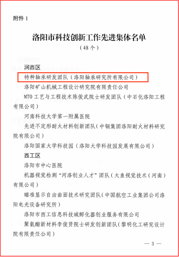 近日,洛陽市科學(xué)技術(shù)局發(fā)布了《關(guān)于表揚(yáng)全市科技創(chuàng)新工作先進(jìn)集體和先進(jìn)個人的通報(bào)》(洛市科﹝2023﹞10號)。公司特種軸承研發(fā)團(tuán)隊(duì)榮獲“洛陽市科技創(chuàng)新工作先進(jìn)集體”榮譽(yù)稱號,公司副總經(jīng)理、總工程師李文超榮獲“洛陽市科技創(chuàng)新工作先進(jìn)個人”榮譽(yù)稱號。