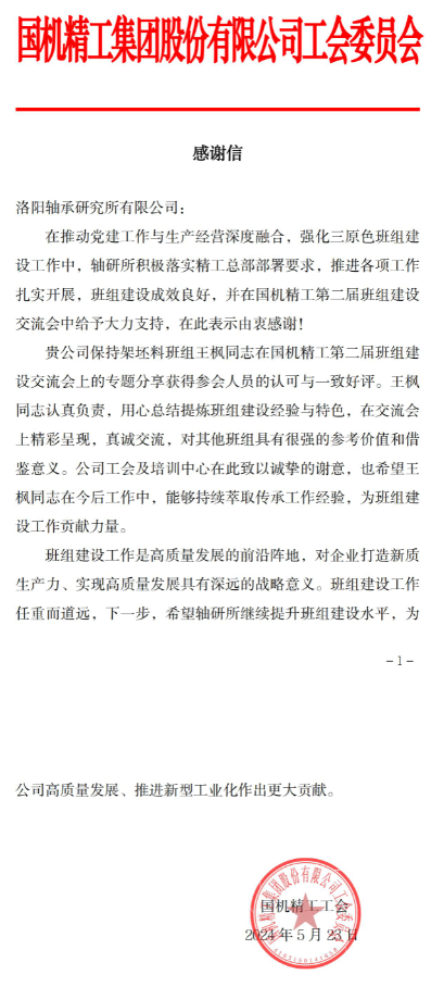 近日,公司收到國(guó)機(jī)精工工會(huì)發(fā)來(lái)的感謝信,信中充分肯定了公司扎實(shí)推進(jìn)“三原色”班組建設(shè)取得的良好成效,對(duì)公司在國(guó)機(jī)精工第二屆班組建設(shè)交流會(huì)中給予的大力支持以及保持架坯料班組王楓的精彩分享表示感謝。