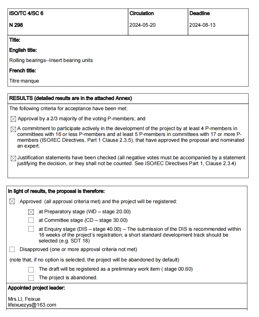 ISO/NP 25260基于我國(guó)國(guó)家標(biāo)準(zhǔn)GB/T 7810-2017《滾動(dòng)軸承 帶座外球面球軸承 外形尺寸》、GB/T 27555-2011《滾動(dòng)軸承 帶座外球面球軸承 技術(shù)條件》而提出,擬規(guī)定帶座外球面球軸承的類(lèi)型及組合、外形尺寸和技術(shù)要求。該國(guó)際標(biāo)準(zhǔn)提案在2023年5月的ISO/TC 4/SC 6年會(huì)上進(jìn)行了初步討論,引起相關(guān)國(guó)家的關(guān)注;后經(jīng)過(guò)草案編制、與有關(guān)國(guó)家和企業(yè)溝通,歷時(shí)一年后于2024年5月20日正式發(fā)起了為期三個(gè)月的新工作項(xiàng)目提案投票,獲得德國(guó)、日本、奧地利、法國(guó)、俄羅斯等國(guó)家的支持,于8月26日正式立項(xiàng)。中國(guó)作為帶座外球面球軸承的重要生產(chǎn)國(guó),由中國(guó)主導(dǎo)研制帶座外球面球軸承國(guó)際標(biāo)準(zhǔn),標(biāo)志著我國(guó)在該產(chǎn)品領(lǐng)域的影響力和話(huà)語(yǔ)權(quán)不斷增強(qiáng),有助于保障我國(guó)該類(lèi)產(chǎn)品在國(guó)際貿(mào)易中的權(quán)益。